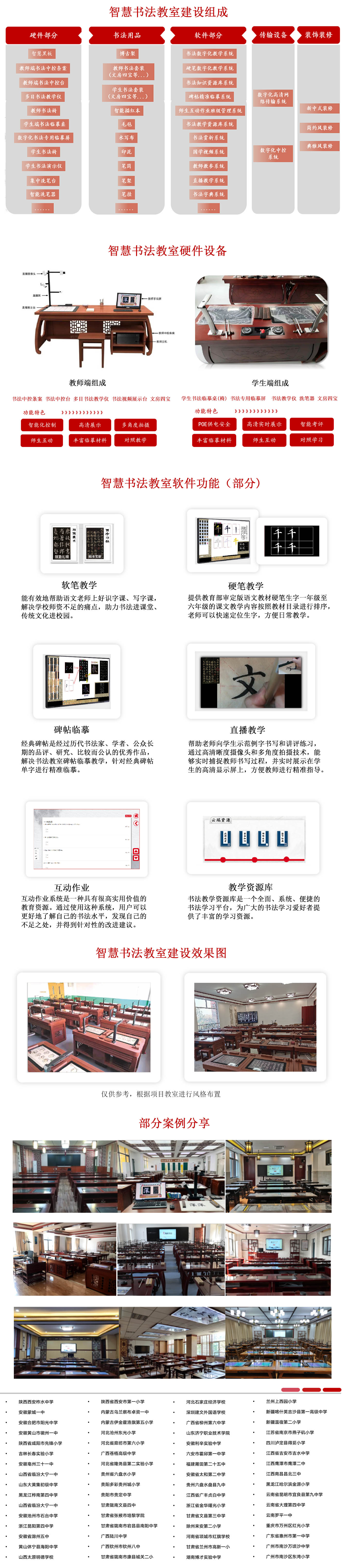 智慧书法教室是专业教授学生书法练习的功能教室,教室由数字化教学软件和信息化硬件构成,装修风格以古典中式为主,通常以2个学生位为一张课桌,一间教室由20—28张课桌组成,能够实现书法教学的一对多、规范化、标准化、专业化。